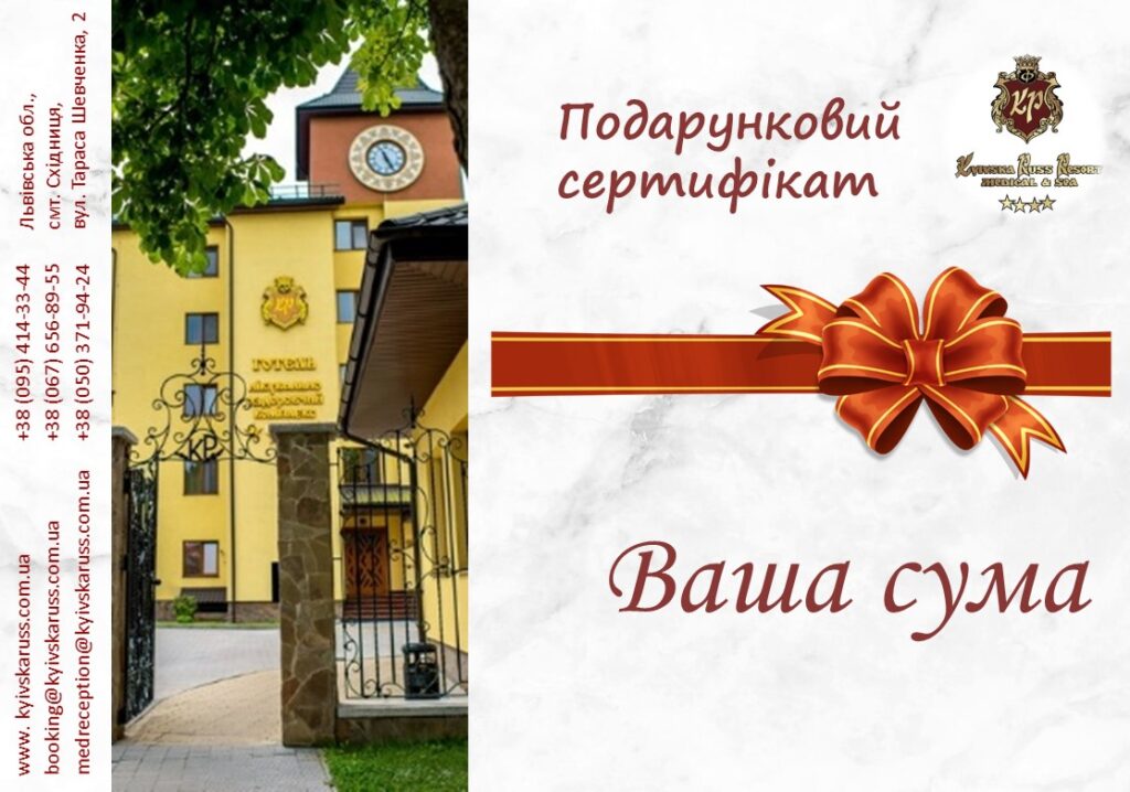Ми готові допомогти Вам. Ви можете замовити у нас подарунковий сертифікат на послуги готельного комплексу та медичного центру. Обирайте фіксовані номінали чи введіть власну вартість сертифікату.