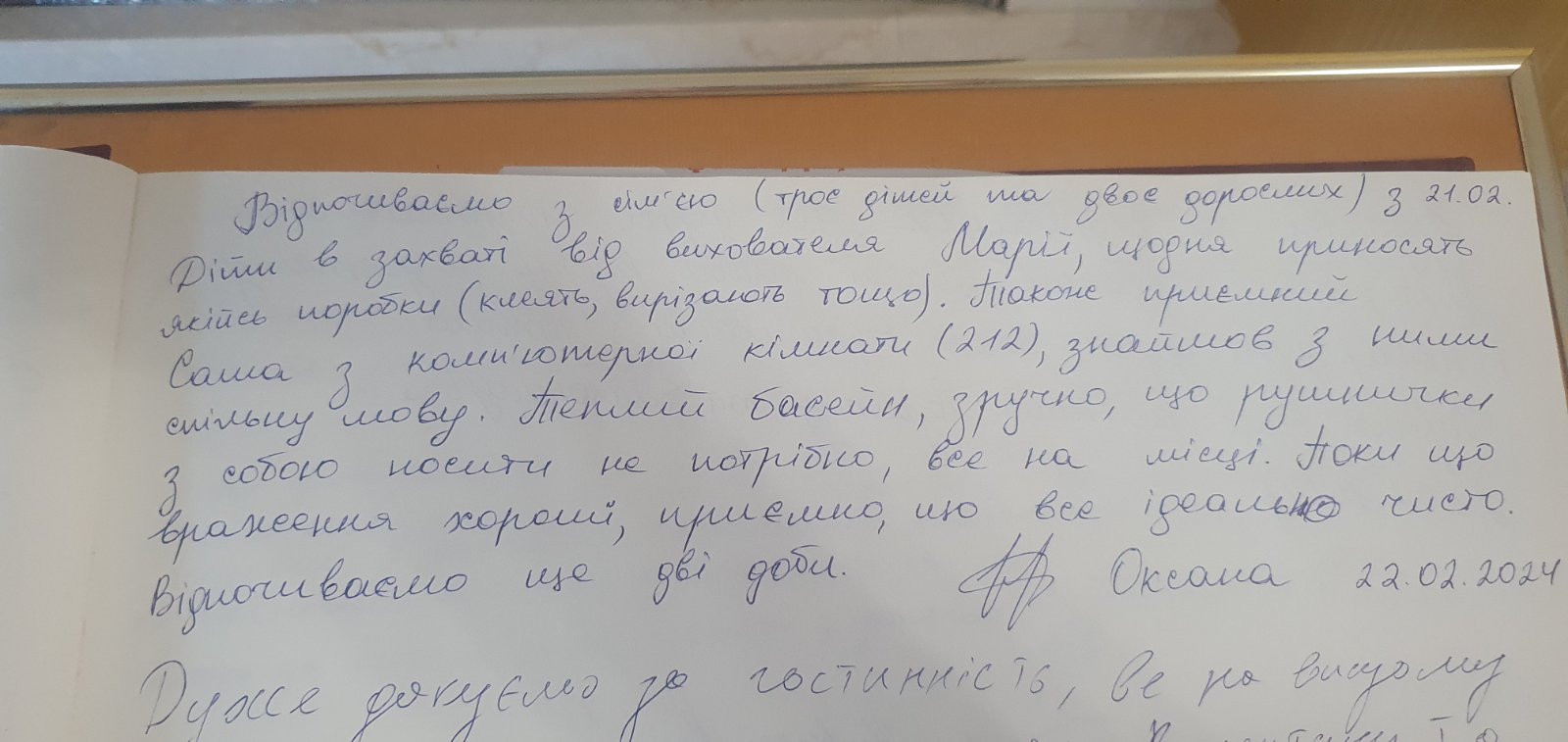 Відпочиваємо з сім’єю (троє дітей та двоє дорослих) з 21.02. Діти в захваті від вихователя Марії, щодня приносять якісь поробки (клеять, вирізають тощо). Також приємний Саша з комп’ютерної кімнати (212), знайшов з ними спільну мову. Теплий басейн, зручно, що рушнички з собою носити не потрібно, все на місці. Враження хороші, приємно, що все ідеально чисто.